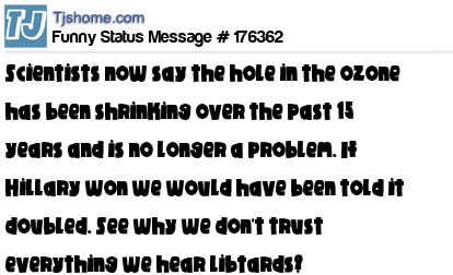 X says Scientists now say the hole in the ozone has been shrinking over the past 15 years and is no longer a problem. If Hillary won we would have been told it doubled. See why we don't trust everything we hear libtards?
