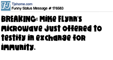 X says BREAKING: Mike Flynn's microwave just offered to testify in exchange for immunity.