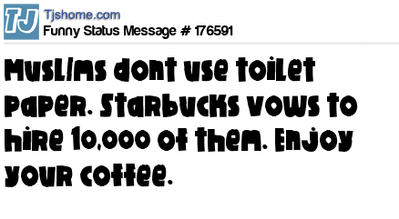 X says Musl/ms dont use toilet paper. Starbucks vows to hire 10,000 of them. Enjoy your coffee.
