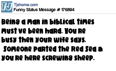 X says Being a man in biblical times must’ve been hard. You’re busy then your wife says, “Someone parted the Red Sea & you’re here screwing sheep.”