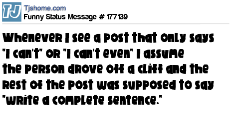 X says Whenever I see a post that only says "I can't" or "I can't even" I assume the person drove off a cliff and the rest of the post was supposed to say "write a complete sentence."