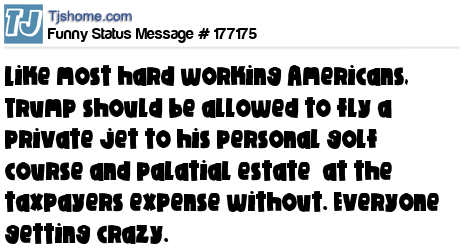 X says Like most hard working Americans, Trump should be allowed to fly a private jet to his personal golf course and palatial estate at the taxpayers expense without. Everyone getting crazy.