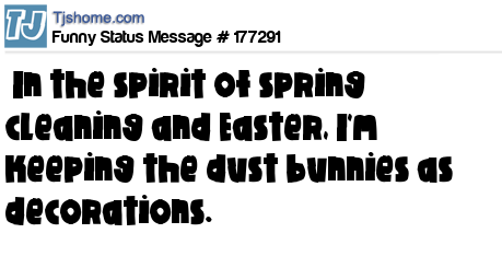 X says In the spirit of spring cleaning and Easter, I'm keeping the dust bunnies as decorations.