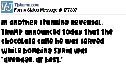 X says In another stunning reversal, Trump announced today that the chocolate cake he was served while bombing Syria was "average, at best."