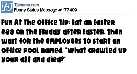 X Fun At The Office Tip: Eat an Easter egg on the Friday after Easter, then wait for the employees to start an office pool named, "What crawled up your a$$ and died?"