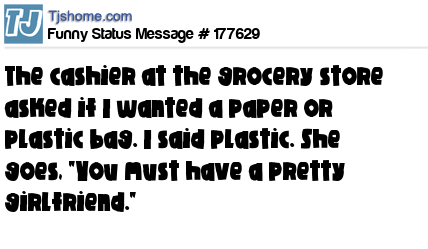 X The cashier at the grocery store asked if I wanted a paper or plastic bag. I said plastic. She goes, "You must have a pretty girlfriend."