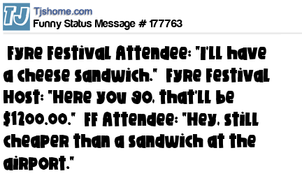 X Fyre Festival Attendee: "I'll have a cheese sandwich." Fyre Festival Host: "Here you go, that'll be $1200.00." FF Attendee: "Hey, still cheaper than a sandwich at the airport."
