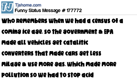 X says Who remembers when we had a census of a coming ice age, so the government & EPA made all vehicles get catalitic converters that made cars get less milage & use more gas, which made more pollution so we had to stop acid rain,&ozone holes. SCIENCE RULES lol