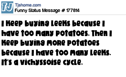 X says I keep buying leeks because I have too many potatoes. Then I keep buying more potatoes because I have too many leeks. It's a vichyssoise cycle.