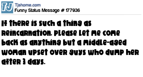 X If there is such a thing as reincarnation, please let me come back as anything but a middle-aged woman upset over guys who dump her after 3 days.