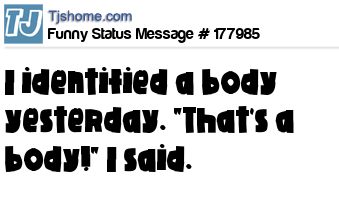 - # 208711 Me: [donating my body to Science] Science: [donates my body to Goodwill] Goodwill: [Leaves body on their lawn, with a sign that says "Free..please take!"] 🤷