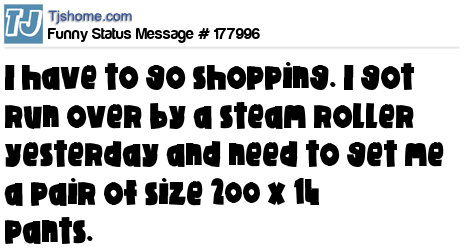 X I have to go shopping. I got run over by a steam roller yesterday and need to get me a pair of size 200 x 14 pants.