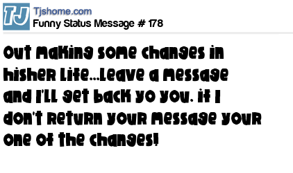 X is out making some changes in hisher life...leave a message and I'll get back yo you. if I don't return your message your one of the changes!
