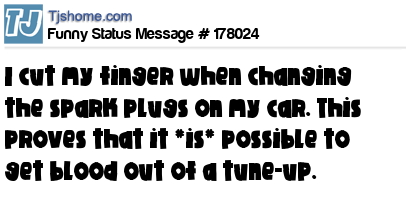 X says I cut my finger when changing the spark plugs on my car. This proves that it *is* possible to get blood out of a tune-up.