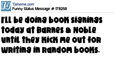 X is I'll be doing book signings today at Barnes & Noble until they kick me out for writing in random books.
