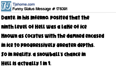 X says Dante, in his Inferno, posited that the ninth level of Hell was a lake of ice known as Cocytus with the damned encased in ice to progressively greater depths. So in reality, a snowball's chance in Hell is actually 1 in 9.