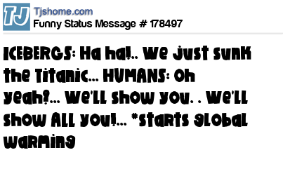 X says ICEBERGS: Ha ha!.. We just sunk the Titanic... HUMANS: Oh yeah?... We'll show you. . We'll show ALL you!... *starts global warming