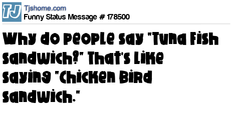 - # 209307 Why do people say, "Tuna fish sandwich"? Nobody says, "Chicken Bird Sandwich".