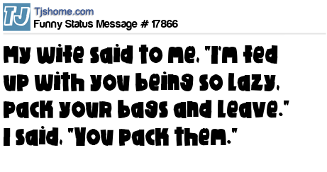 X My wife said to me, "I'm fed up with you being so lazy, pack your bags and leave." I said, "You pack them."
