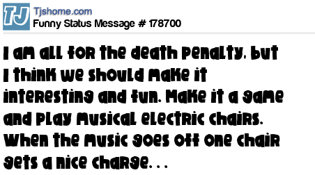 X says I am all for the death penalty, but I think we should make it interesting and fun. Make it a game and play musical electric chairs. When the music goes off one chair gets a nice charge. . .