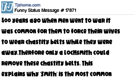 X 500 years ago when men went to war it was common for them to force their wives to wear chastity belts while they were away.Therfore only a locksmith could remove these chastity belts. This explains why 'Smith' is the most common name in the phonebook...