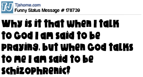 - # 10714 Why is it that when I talk to God I am said to be praying, but when God talks to me I am said to be schizophrenic?