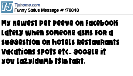 X says My newest pet peeve on Facebook lately when someone asks for a suggestion on hotels restaurants vacations spots etc.. google it you lazy/dumb F$)&tart.