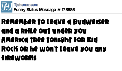 - # 192938 Hey everyone. Remember to leave out a riffle and some Budweiser, this 4th of July eve, or Kid Rock won't bring you any fireworks.