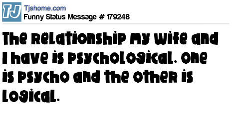 - # 206724 Yep the relationship my wife and I have is psychological. One is psycho and the other is logical.