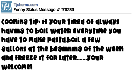 X says cooking tip: if your tired of always having to boil water everytime you have to make pasta,boil a few gallons at the beginning of the week and freeze it for later.......your welcome!