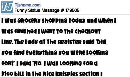 X says I was grocery shopping today and when I was finished I went to the checkout line. The lady at the register said "Did you find everything you were looking for?" I said "No. I was looking for a $100 bill in the Rice Krispies section I but didn't find one."