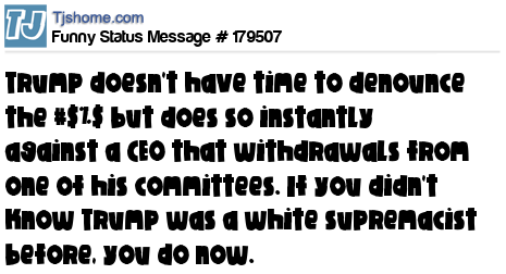 X says Trump doesn't have time to denounce the #$%$ but does so instantly against a CEO that withdrawals from one of his committees. If you didn't know Trump was a white supremacist before, you do now.
