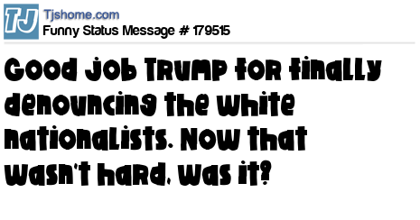 X is Good job Trump for finally denouncing the white nationalists. Now that wasn't hard, was it?