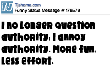 X says I no longer question authority; I annoy authority. More fun, less effort.