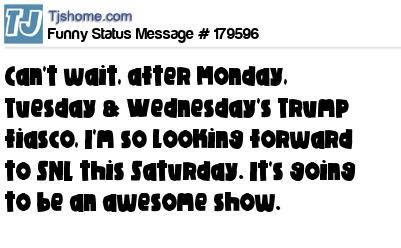 X is Can't wait, after Monday, Tuesday & Wednesday's Trump fiasco, I'm so looking forward to SNL this Saturday. It's going to be an awesome show.