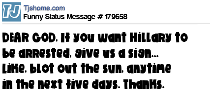 X says DEAR GOD, If you want Hillary to be arrested, give us a sign... Like, blot out the sun, anytime in the next five days. Thanks.