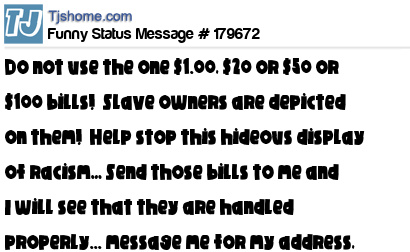 X says Do not use the one $1.00, $20 or $50 or $100 bills! Slave owners are depicted on them! Help stop this hideous display of racism… Send those bills to me and I will see that they are handled properly... message me for my address,