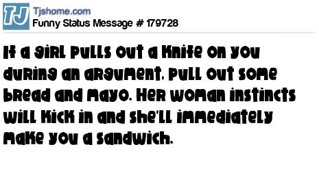 - # 164885 If a girl pulls out a knife on you during a fight, pull out some bread & mayo. Her woman instincts will kick in & she'll make you a sandwich