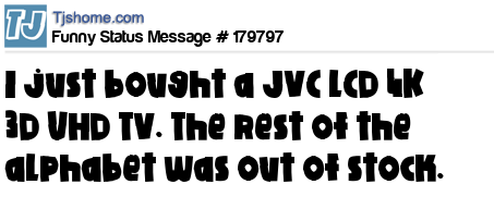 X says I just bought a JVC LCD 4K 3D UHD TV. The rest of the alphabet was out of stock.