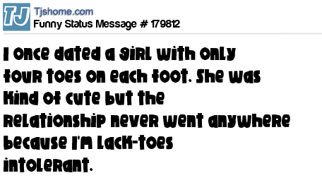 - # 203475 I once dated a girl in college with only four toes on each foot. She was kind of cute but the relationship never went anywhere because I'm lack-toes intolerant.