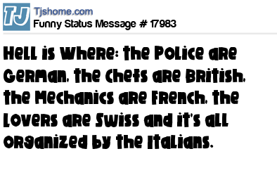- # 37161 Heaven is where the police are British, the chefs are Italian, the mechanics are German, the Lovers are french and it is all organized by the Swiss. Hell is where the police are German, the chefs are British, the mechanics are French, the lovers are Swiss