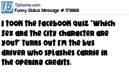X says I took the Facebook quiz "Which Sex and the City character are you?" Turns out I'm the bus driver who splashes Carrie in the opening credits.