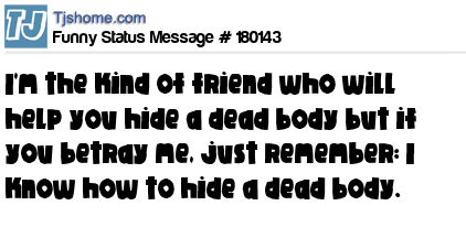 - # 136771 I'm the kind of friend who will help you hide a dead body, but if you betray me, just remember: I know how to hide a dead body.