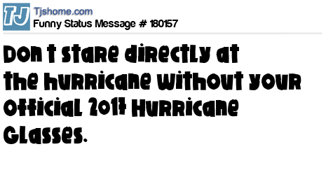 - # 69603 Can we name the next hurricane Shaniqua or something? I feel like if we give hurricanes ghetto names, people will be more inclined to get away from them. Hurricane Irene sounds friendly. Hurricane Shaniqua will rip out your weave if you look at it wrong.
