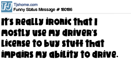 X says It's really ironic that I mostly use my driver's license to buy stuff that impairs my ability to drive.