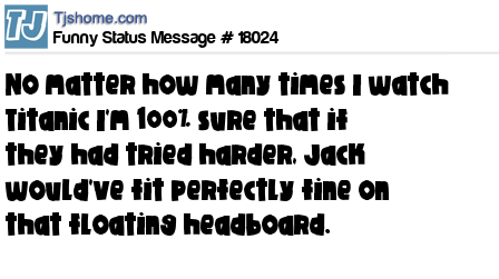 - # 34927 Every time I watch Titanic, I'm more convinced that if they had tried harder, Jack would've fit perfectly fine on that floating headboard.