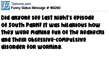 X is Did anyone see last night's episode of South Park? It was hilarious how they were making fun of the rednecks and their obsessive-compulsive disorder for working.