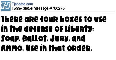 X says There are four boxes to use in the defense of Liberty: Soap, Ballot, Jury, and Ammo. Use in that order.
