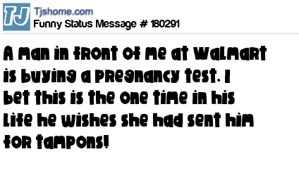 X says A man in front of me at Walmart is buying a pregnancy test. I bet this is the one time in his life he wishes she had sent him for tampons!