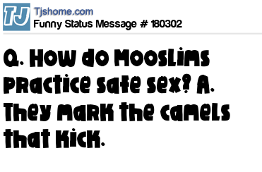 X says Q. How do Mooslims practice safe sex? A. They mark the camels that kick.